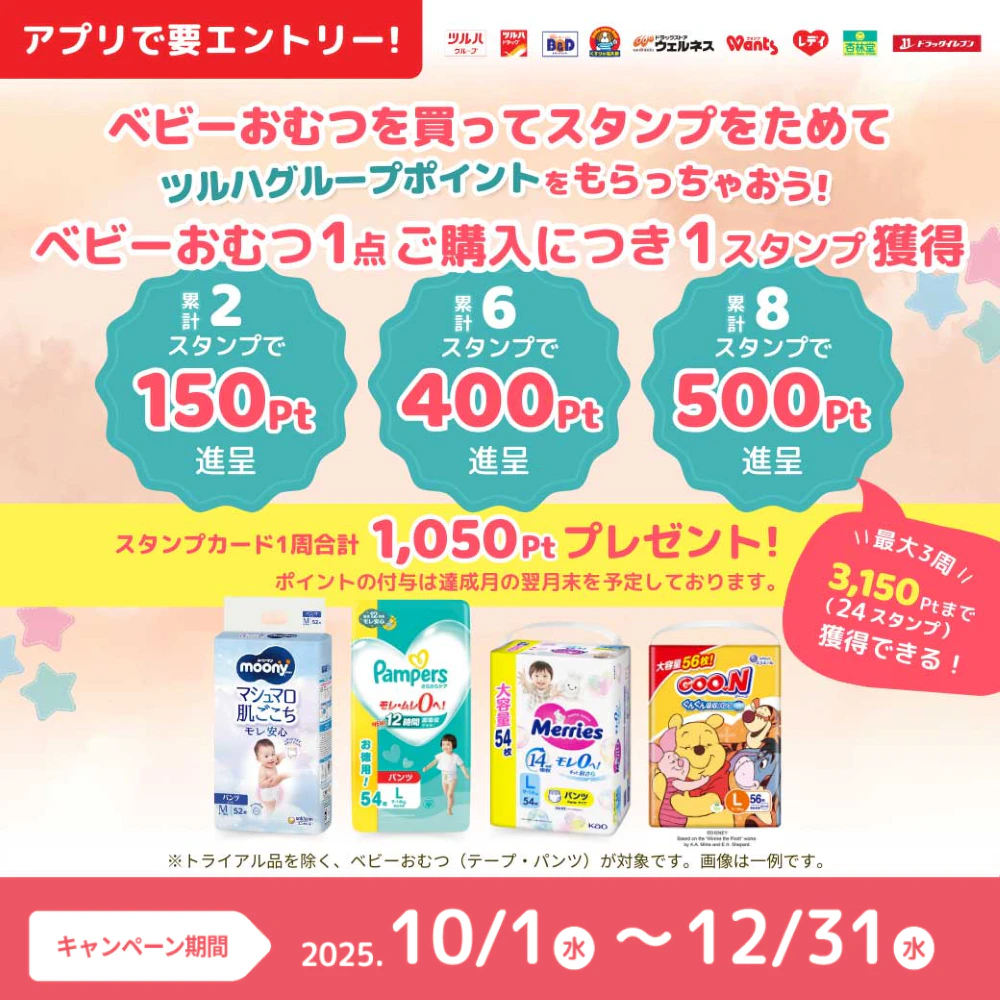 ベビーおむつを買ってスタンプをためて╲ツルハグループポイントをもらっちゃおう!/(10/1~12/31)