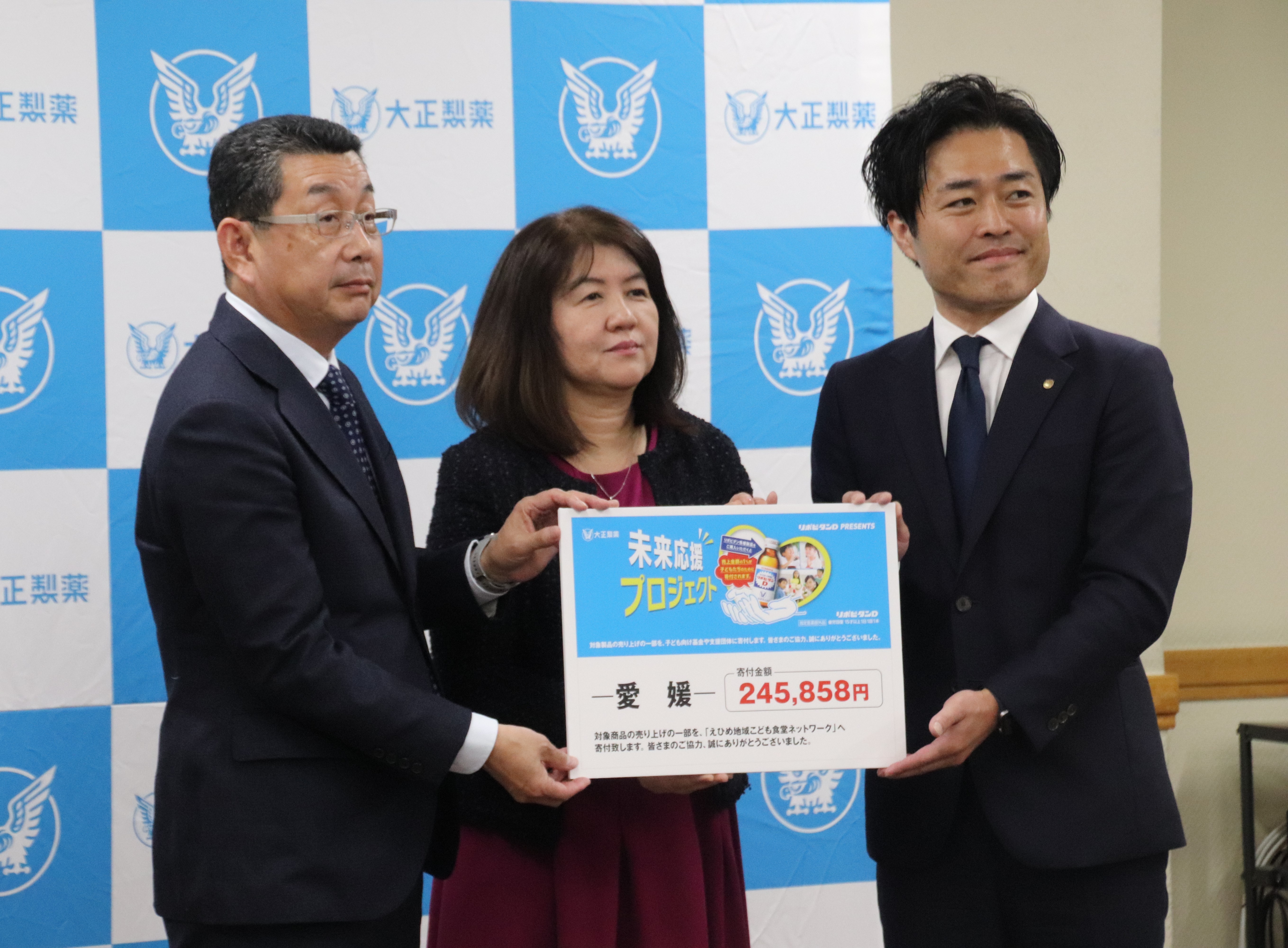 この度2025年秋より実施した本企画の実施店における対象製品の売上額をまとめ、その1%(※396,733円)を大正製薬様から各団体に寄付を頂き、2月26日(木)に愛媛県松山市にて寄付金贈呈式を行いました。趣旨にご賛同いただき対象商品をご購入下さいました皆さまには感謝申し上げます。